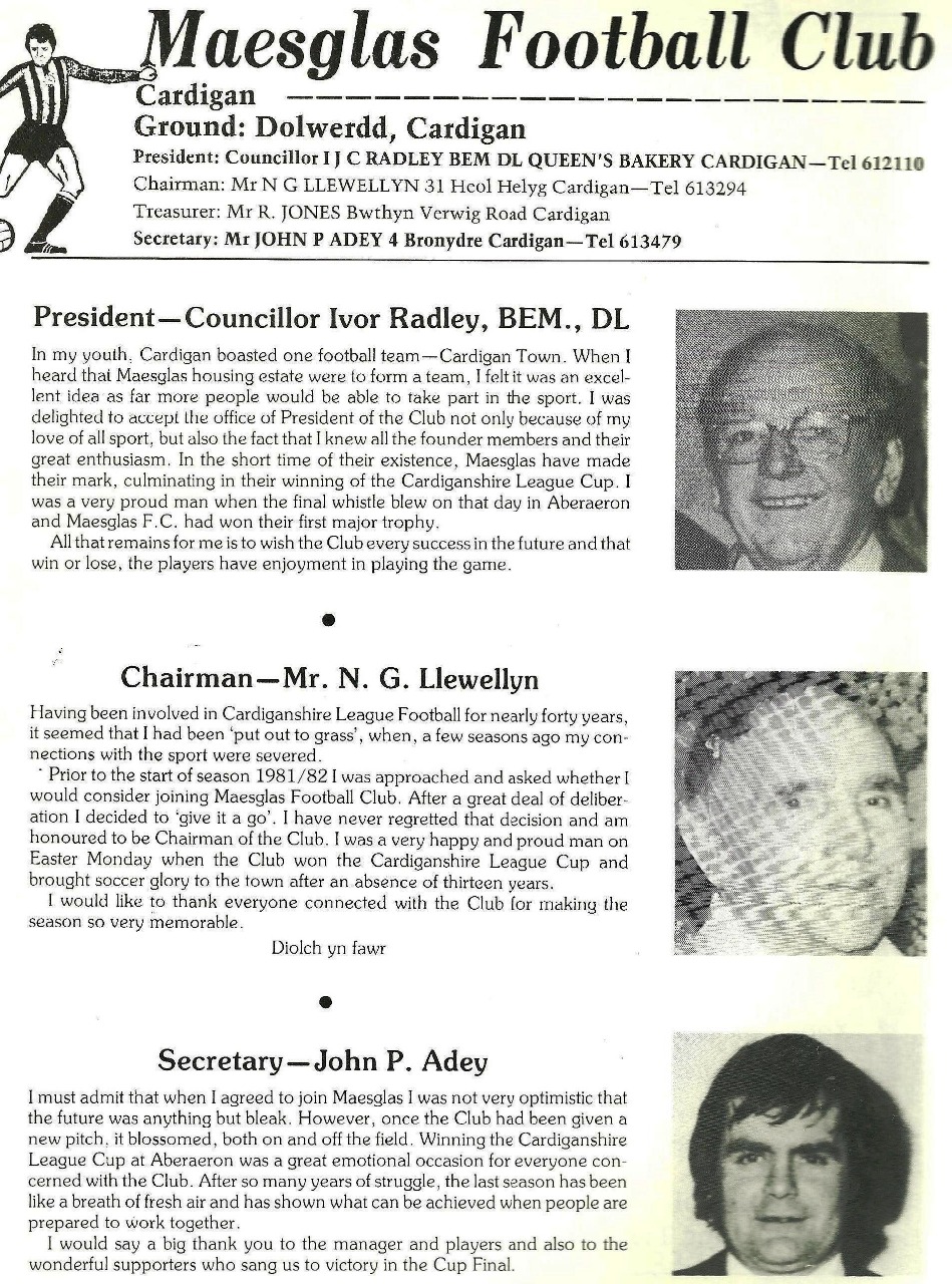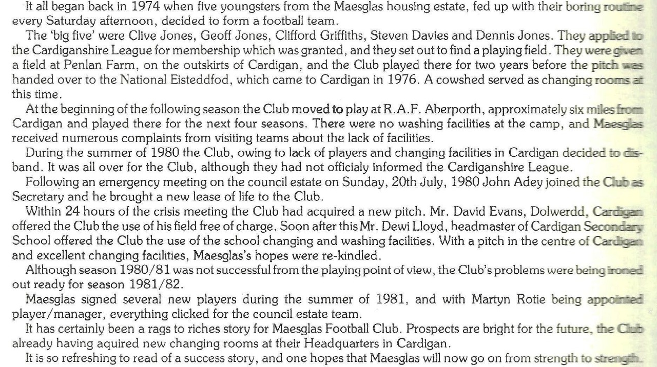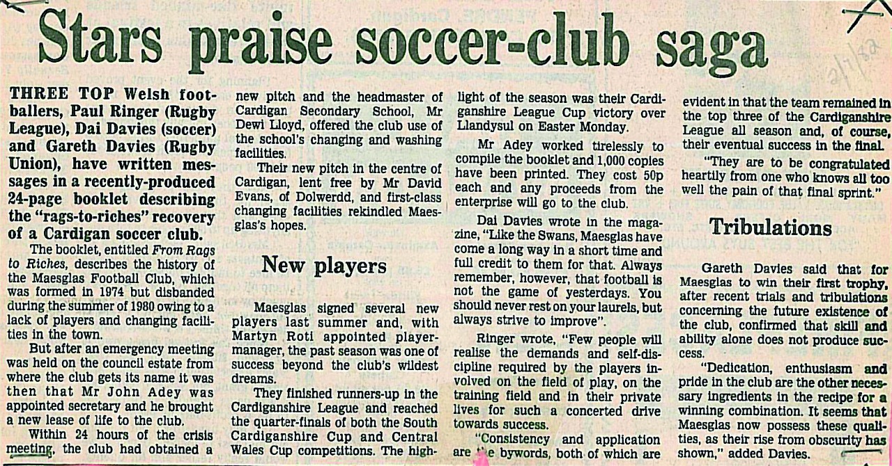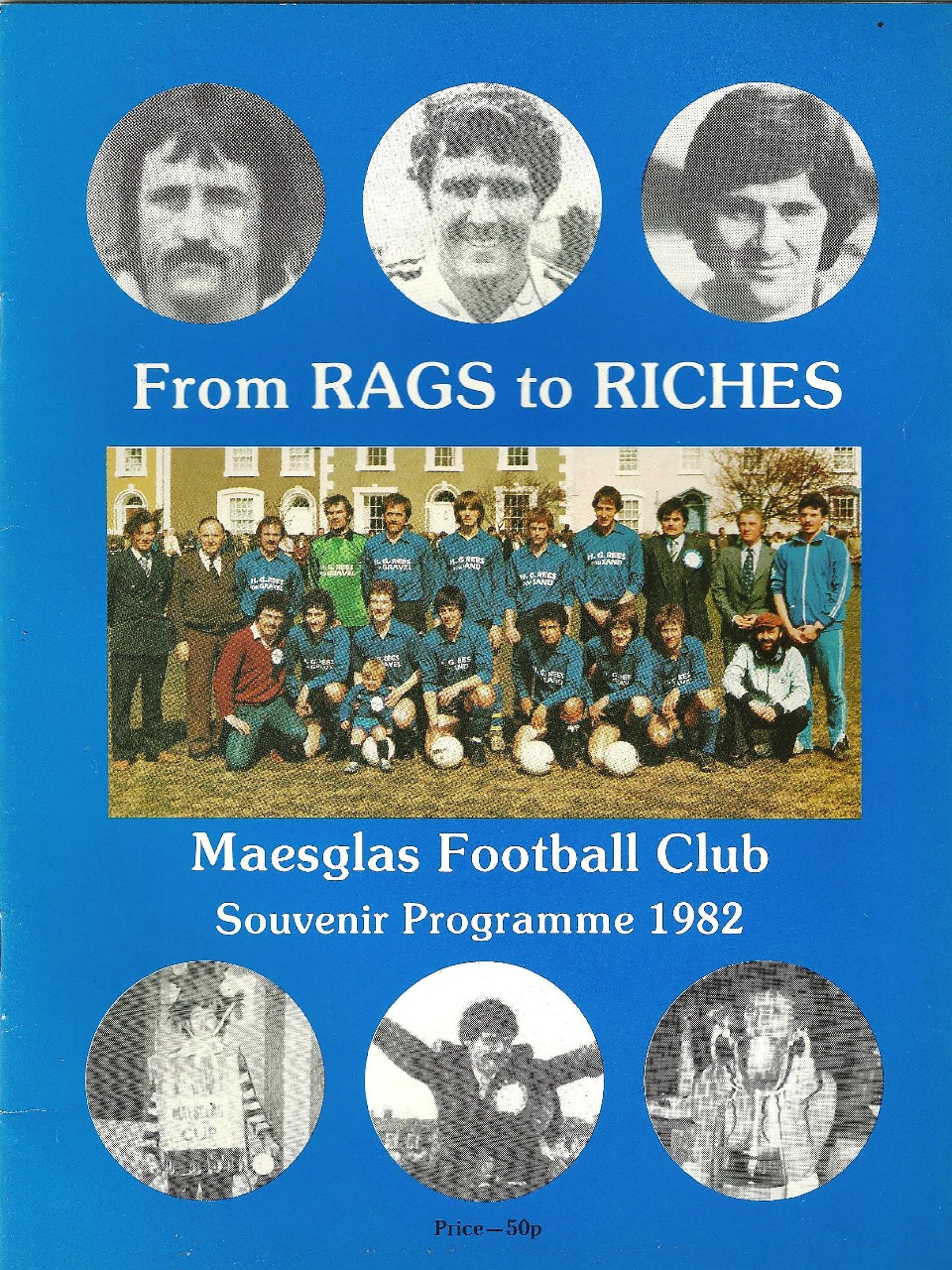 The Rags to Riches souvenir programme 1982 with details and events from Maesglas Football Club, with messages from Paul Ringer, Gareth Davies Welsh Rugby legends and welsh football goal keeping legend Dai Davies. click on Picture above